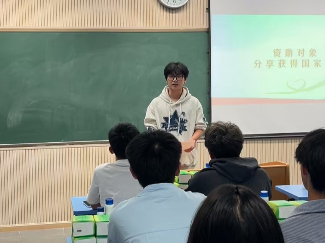 国家奖学金候选人刘锦松作为资助员工代表,以其个人成长经历为线索,分享了在逆境中坚韧不拔、勇于挑战的故事,激励同学们珍惜资助机会,积极参与社会实践与班级活动,以智慧和勇气书写属于自己的青春篇章。